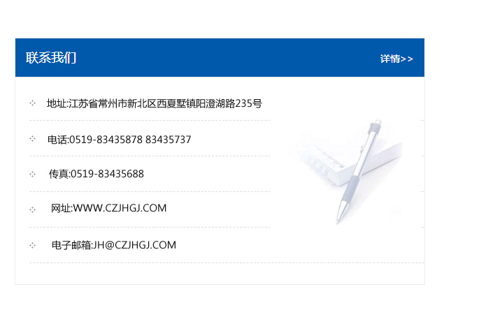 地址:常州市新北區友邦商務大廈1幢16、17層  電話:0519-85101652  傳真:0519-85112595  郵編:213022  網址:www_cz-jiayue_cn.cbd-cd.com  郵箱:xiajifengaa@163.com